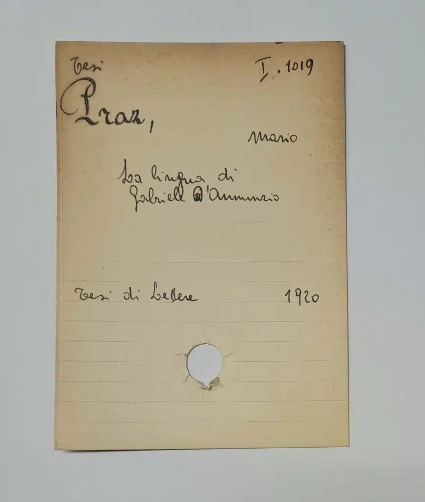Se la vocazione di Mario Praz per le humanae litterae non fosse stata tanto accesa da indurlo ad abbandonare una grigia carriera giurisprudenziale in favore di più accattivanti interessi storico-letterari, non avremmo forse beneficiato dei decisivi risultati a cui hanno condotto le sue indagini nei territori dell’opera dannunziana. È bene infatti ricordare che, prima di aver rivestito un ruolo cruciale nell’inquadramento delle strategie compositive adottate dall’abruzzese e di venire in seguito elevato a capofila dell’anglistica italiana, il critico romano fu brillante studente di diritto: ottenuto il diploma liceale all’istituto fiorentino Galilei, Praz avviò il proprio iter giurisprudenziale nel 1914 presso l’Ateneo di Bologna, per passare l’anno seguente all’Università di Roma; conseguì la laurea a pieni voti, ma comprese presto che «la legge non faceva per [sé]», e prospettò così «alla famiglia un prolungamento degli studi, di due anni, per laurear[si] in lettere» (CV, p. 42). La consapevolezza che le materie giuridiche non gli erano congeniali traspare da un inciso in cui confessava en passant una chiara inclinazione per gli studia humanitatis, ricordando, oltre agli insegnamenti di Storia dell’arte impartitigli da Antonio Muñoz, le lezioni di Cesare De Lollis, seguite alla Sapienza in compagnia dell’amico e futuro linguista Bruno Migliorini: «Più tardi, suggestionati anche dalle lezioni di Antonio Muñoz (perché più che i corsi di legge che dovevamo frequentare, c’interessavano quelli di lettere che seguivamo per nostro conto), ci entusiasmammo per la Roma barocca» (CV, p. 11). Vinte le resistenze di alcuni familiari, che intravedevano nell’avvocatura una strada economicamente più vantaggiosa, Praz si iscrisse nel 1918 all’Istituto di Studi Superiori dell’Università di Firenze, dove poté dedicarsi ai corsi di letteratura e filologia, ammaliato dal carisma intellettuale di insigni esponenti della scena critica italiana, tra cui Giorgio Pasquali ed Ernesto Giacomo Parodi. Sotto la direzione di quest’ultimo stese e discusse la propria tesi di laurea, mirata ad un’analisi linguistica dei testi dannunziani, che lo portò a scoperte rivelatrici sull’impiego delle fonti da parte del poeta. Un parto che, sebbene approdato all’esito desiderato, si presentò subito travagliato, come rivela il carteggio con Bruno Migliorini, a cui Praz lamentava le fatiche comportate dallo spoglio lessicale del corpus di d’Annunzio: